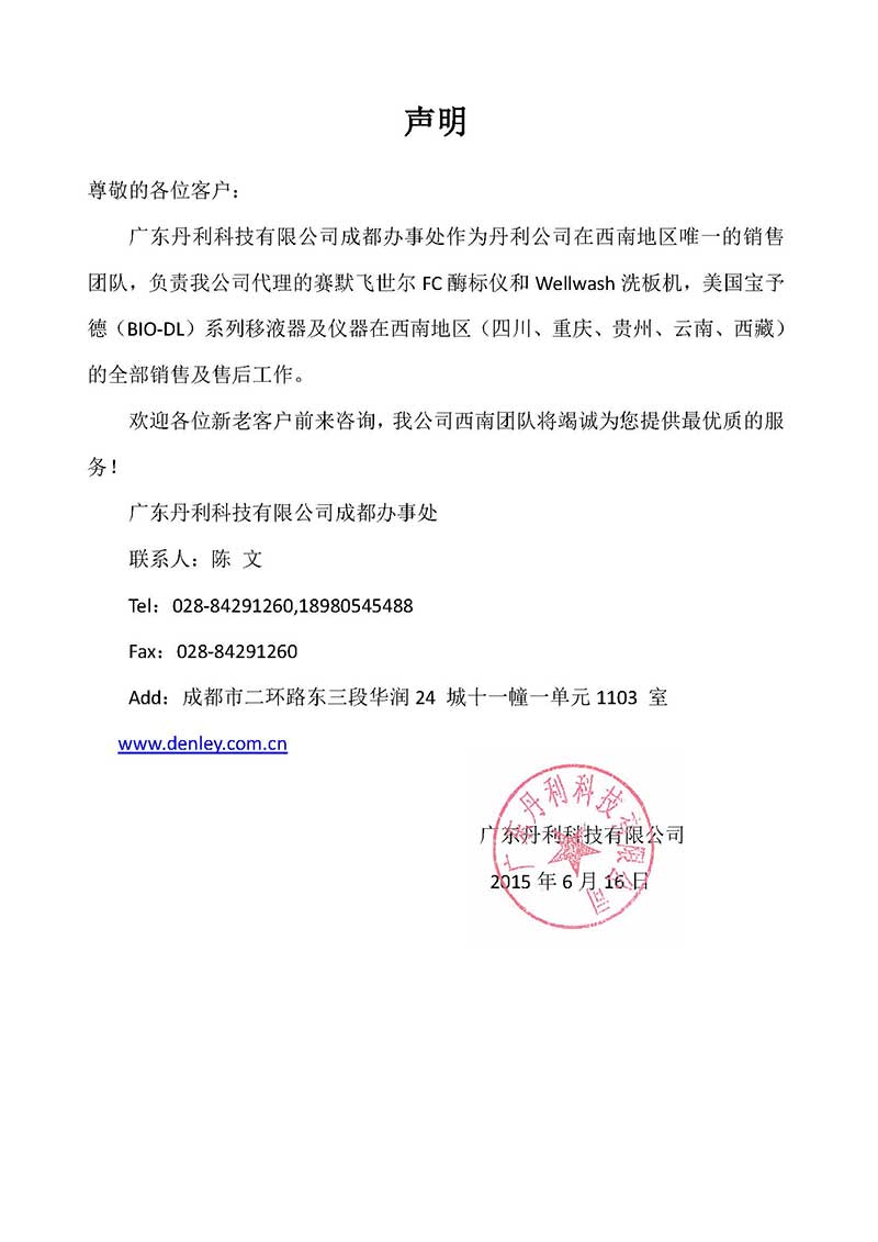 尊敬的各位客戶: 廣東丹利科技有限公司成都辦事處作為丹利公司在西南地區(qū)唯一的銷售團隊,負(fù)責(zé)我公司代理的賽默飛世爾FC酶標(biāo)儀和Wellwash洗板機,美國寶予德(BIO-DL)系列移液器及儀器在西南地區(qū)(四川、重慶、貴州、云南、西藏)的全部銷售及售后工作。